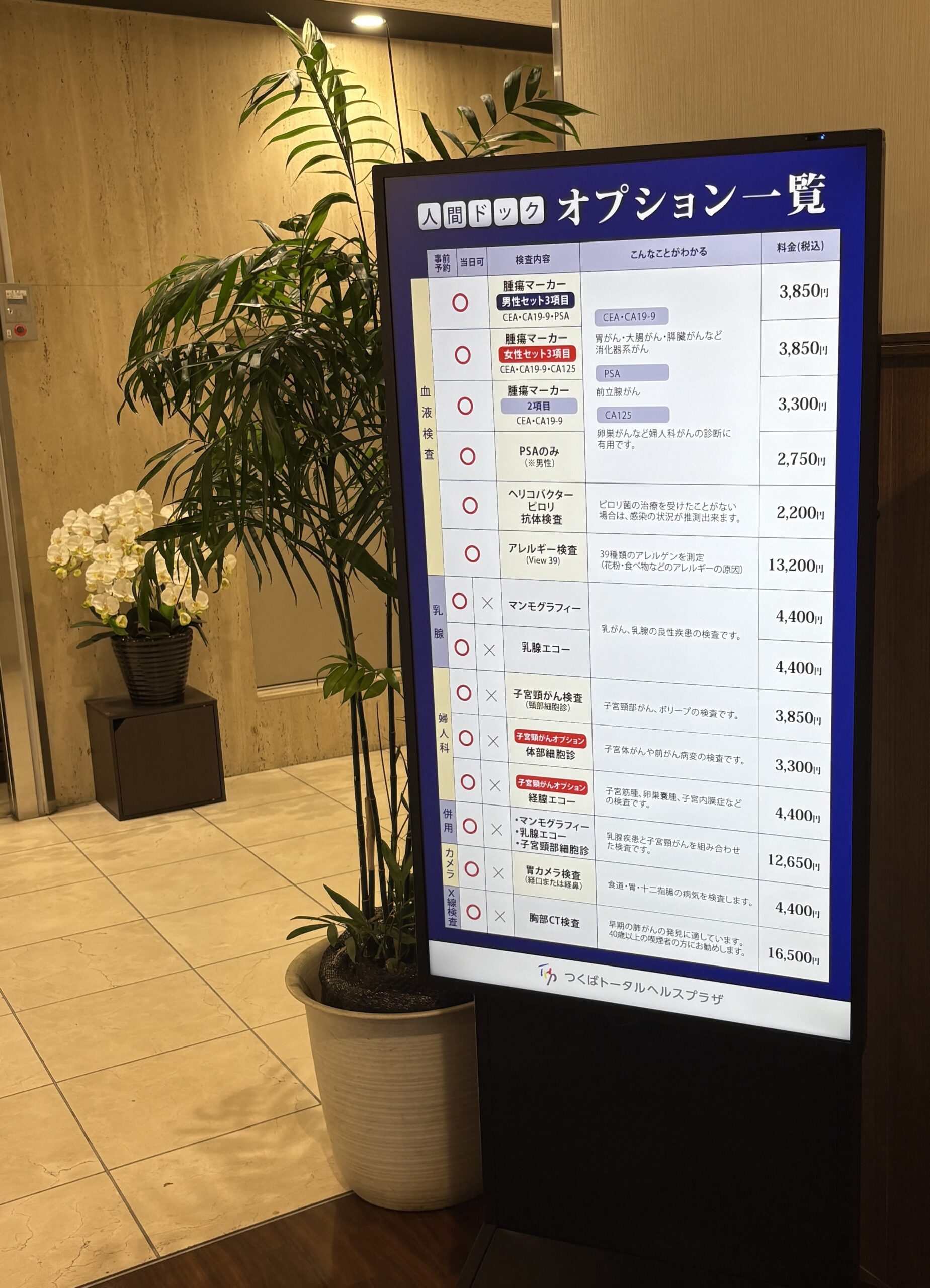 つくばトータルヘルスプラザでは、皆様にドック・健診についてより詳しくお伝えするため、館内にデジタルサイネージによるご案内システムを導入いたしました。