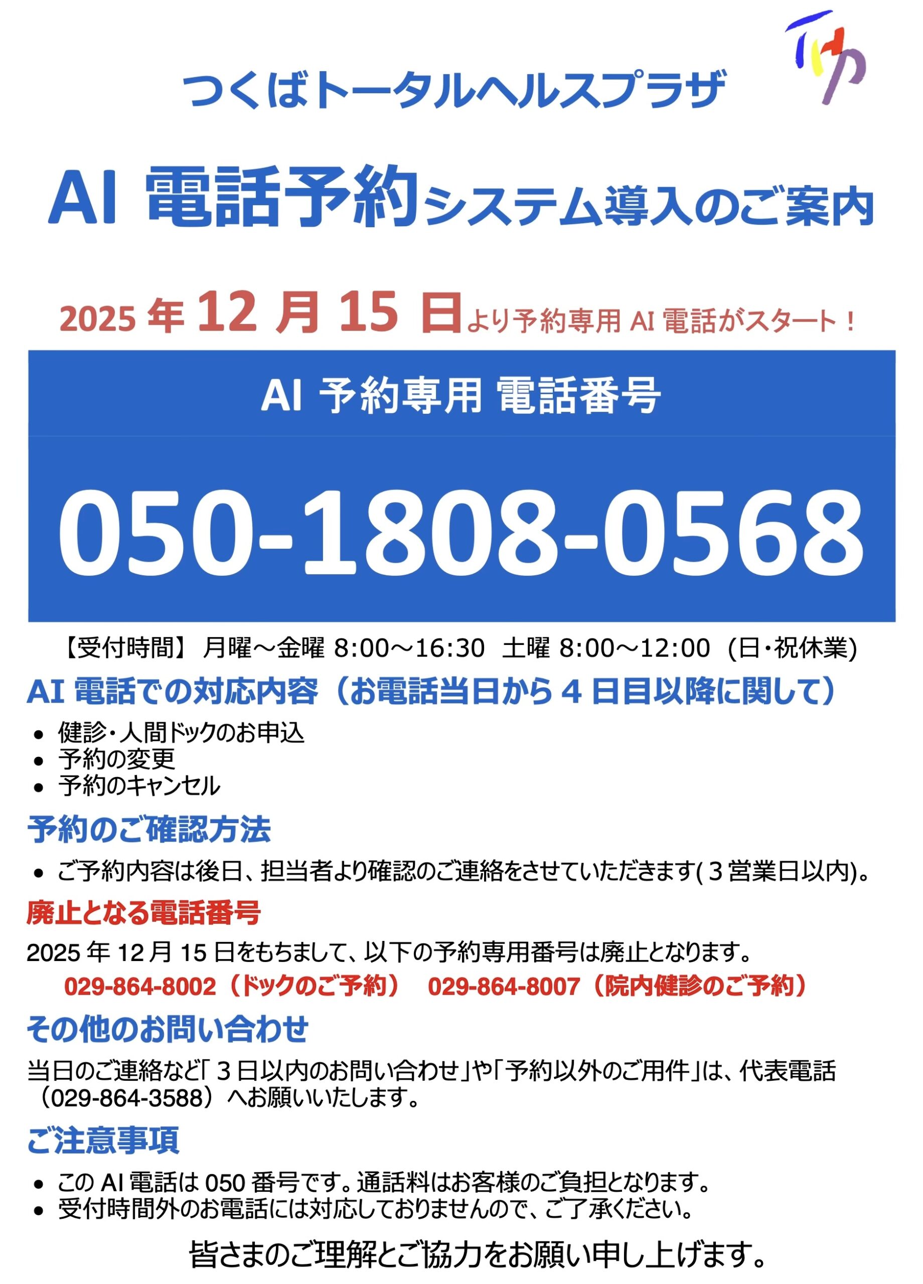 【重要なお知らせ】12月15日より予約専用電話がAI電話での受付に変更となります。