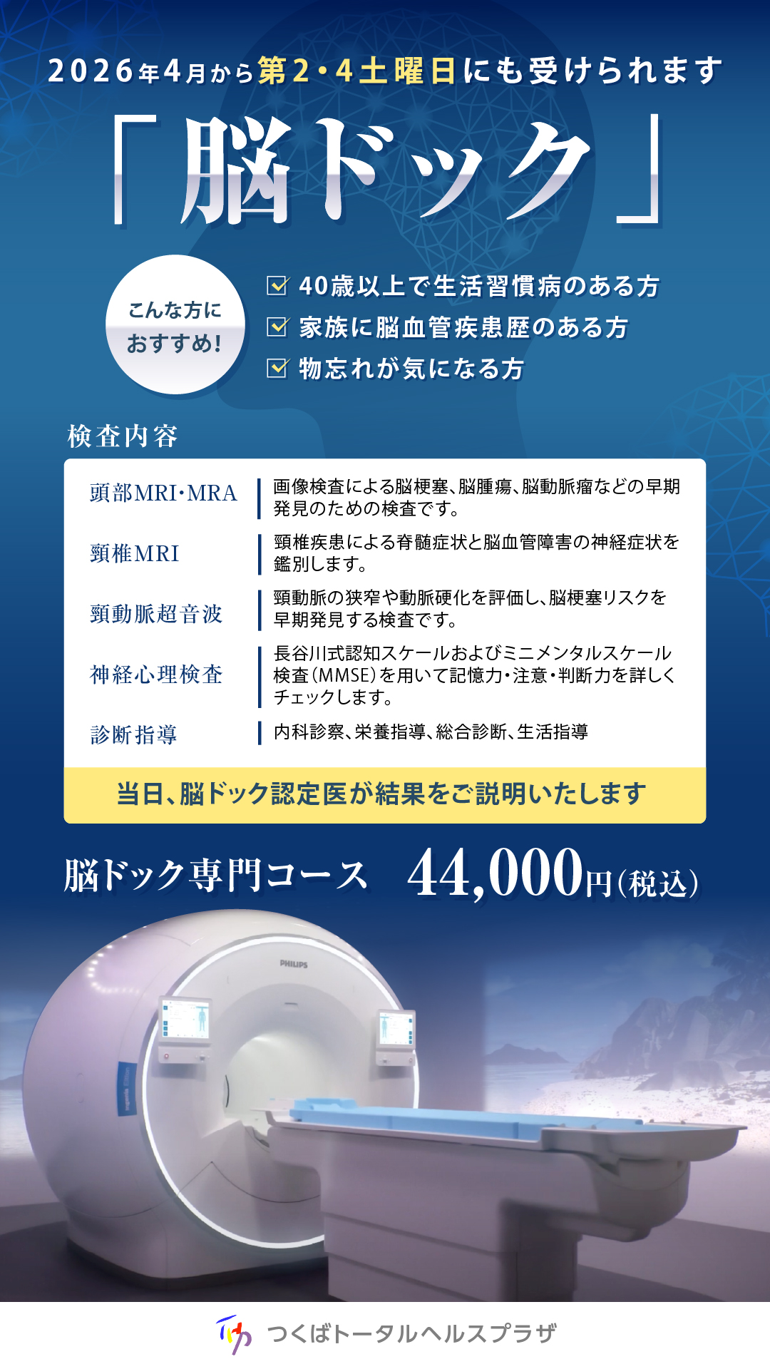 【脳ドック】2026年4月から第2・第4土曜日も受診いただけます 2026.03.03 つくばトータルヘルスプラザ これまで月曜日〜金曜日に実施してまいりました「脳ドック」について、2026年4月より第2・第4土曜日にも受診いただけるようになりました。平日のスケジュールが合わず受診を諦めていた方も、土曜日に「脳ドック」をご予約いただけるようになりました。ぜひご利用ください。